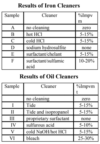 Sodium hydroxide is sometimes effective to remove oil. This cleaner was followed by hot HCl to remove any precipitants formed during the caustic treatment.Overall performance improvement was similar to that found with other acid cleaners.