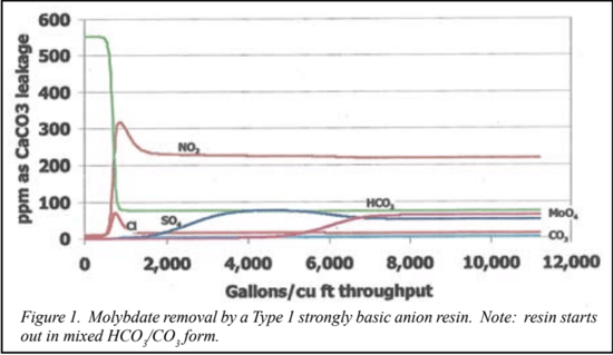 Figure 1 shows that a single cubic foot (ft3) of resin could handle the job if all the flow could be processed through the resin bed at a reasonable flow rate. It can be seen that about two-thirds of the resin’s capacity is filled by molybdenum before the resin becomes exhausted. However, even if such a scheme could be put into action, it would require full-time monitoring of the influent and effluent to prevent overrunning the bed, or in the case of recirculation, shutting off the flow to the resin bed once the maximum possible reduction of molybdate was accomplished. Otherwise, the molybdate “free” solution would act as a regenerant, and begin pushing molybdate from the resin bed.
