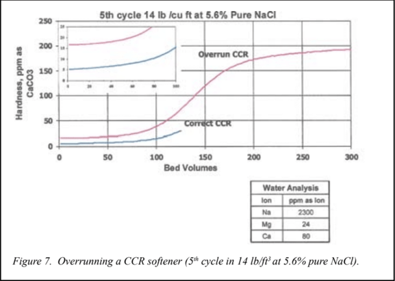 At higher TDS, the effect of hardness in the salt is magnified, particularly with coflow regeneration. In a well-operated countercurrent regenerated system, the hardness leakage is almost entirely dependent on the salt purity (hardness impurity). In cocurrent regeneration, all the hardness in the exhausted resin is pushed through the exit end. So in a cocurrent regenerated system, the exit end of the resin bed sees spent brine with hardness mixture as the regenerant.