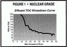 Three graphs are presented that show the actual TOC rinse-downs of virgin mixed beds that are available in the marketplace. The first, a standard nuclear grade, takes a long time (measured in bed volumes of rinse water) to reach lowTOC levels. Given enough water, almost any mixed bed will rinse down to lower TOC numbers. The second graph shows a semiconductor grade mixed bed that is certified to produce 18.3 megohms resistivity water. The TOC rinse down shows effluent levels of less than 50 ppb TOC in 50bed volumes. Finally, the last curve is a low TOC preconditioned mixed bed. The specifications call for less than 25 ppb TOC in less than 25 bed volumes. This particular batch easily meets that specification, eventually rinsing down to less than 10 ppb TOC!SummaryEnd-users that require ultrapure water produced by ion ex-change with low TOC have a choice of portable exchange services or purchasing preconditioned ultrapure mixed beds.New, preconditioned low TOC mixed bed resin can save the user time and rinse water by providing low TOC effluent water after a minimum of rinsing. It is always a good idea to get the TOC rinse down certification curve with each batch that is purchased.